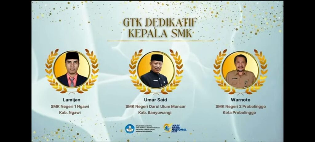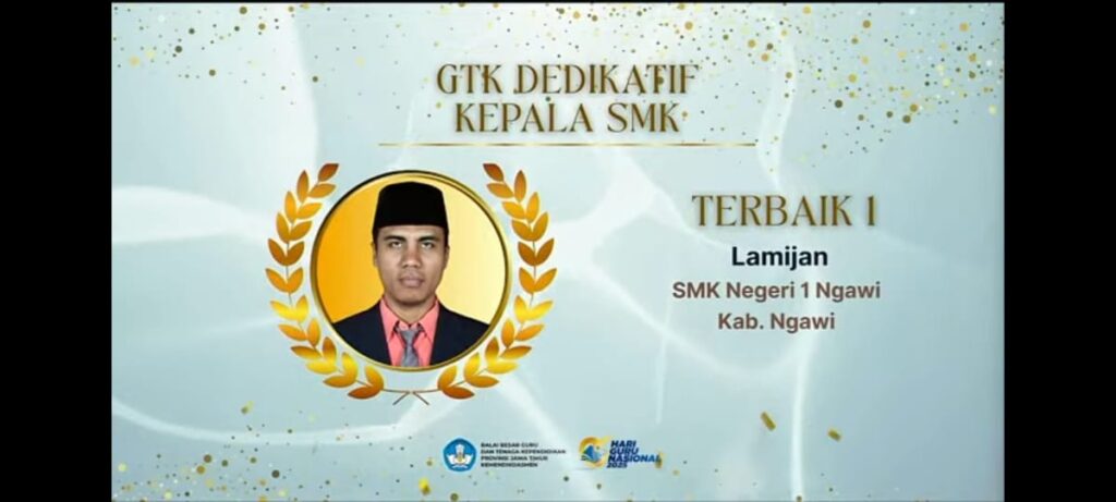 Ngawi – Kebanggaan besar kembali menghampiri keluarga besar SMK Negeri 1 Ngawi. Dr. Lamijan, S.Pd., M.Si., Kepala SMKN 1 Ngawi, berhasil menyabet gelar Juara 1 GTK Dedikatif kategori Kepala Sekolah SMK dalam Event Apresiasi GTK Tingkat Provinsi Jawa Timur 2025.