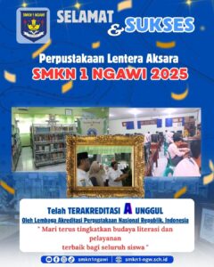 NGAWI – Kebanggaan kembali menghampiri SMKN 1 Ngawi. Perpustakaan sekolah yang bernama “Lentera Aksara” secara resmi telah menyandang predikat Akreditasi A UNGGUL dari Lembaga Akreditasi Perpustakaan Nasional Republik Indonesia. Sertifikat yang merupakan pengakuan tertinggi terhadap kualitas perpustakaan ini diterima oleh sekolah pada tahun 2025.